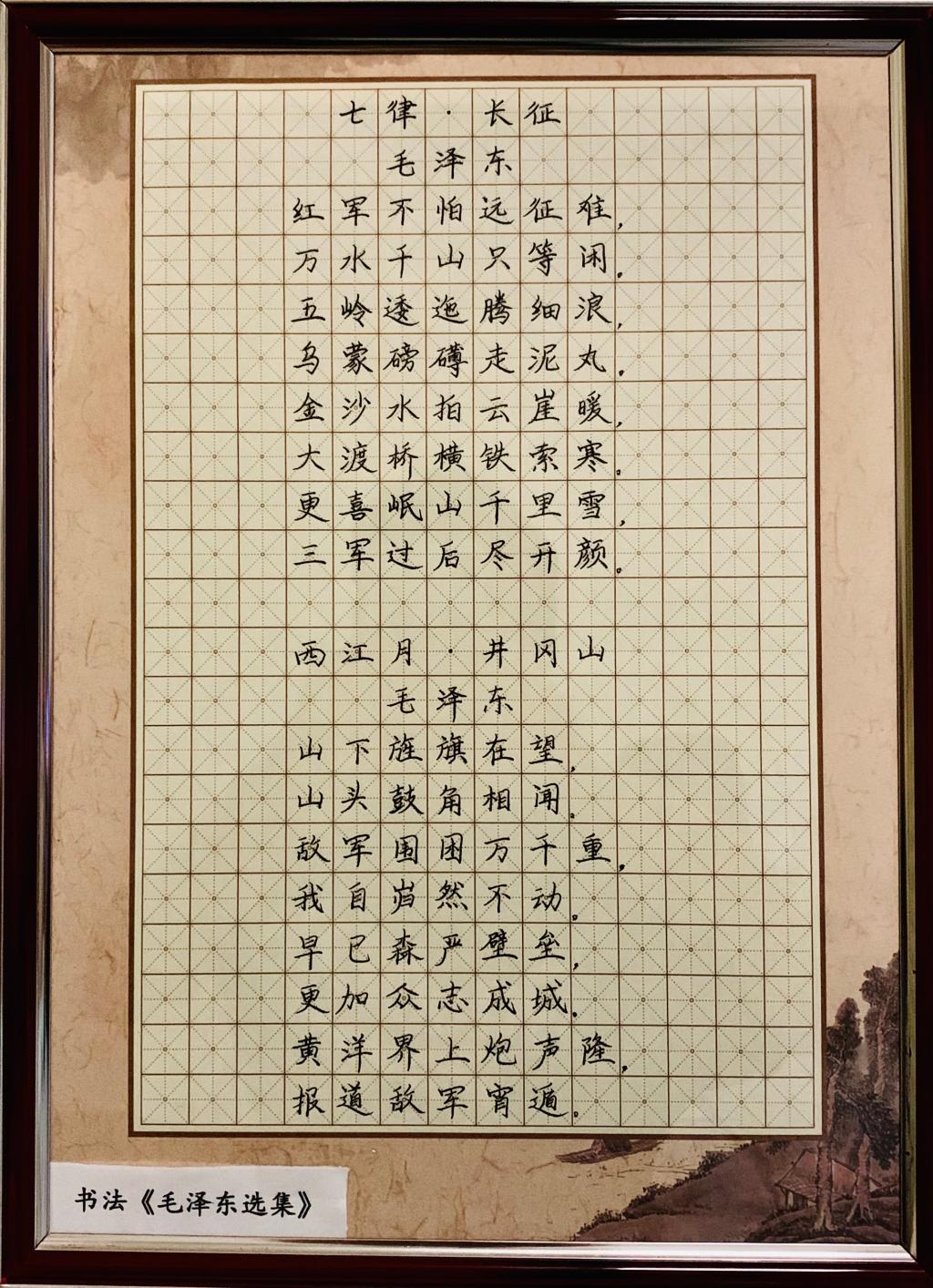作品簡介:毛主席不僅是偉大的革命家、政治家,也是獨樹一幟的大詩人。豪邁的氣派,自信樂觀的英雄主義豪氣,具有強大的感染力。即使在最惡劣的政治、軍事條件下,毛主席也從未動搖、改變。本作品利用女生柔美而不失力量的筆鋒,刻畫出我們對毛主席深深的思念。(初審:肖月;復審:曾衛平)