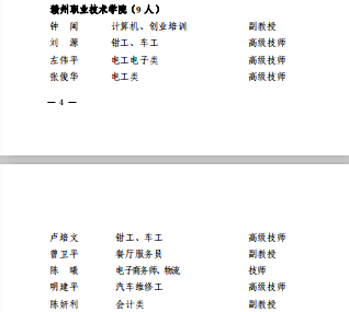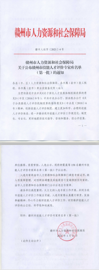日前,贛州市人力資源和社會保障局發文,公布了贛州市技能人才專家庫名單(第一批),我院鐘閩、劉源、左偉平、張俊華、盧培文、曾衛平、陳曦、明建平、陳妍利等9名教師入選。