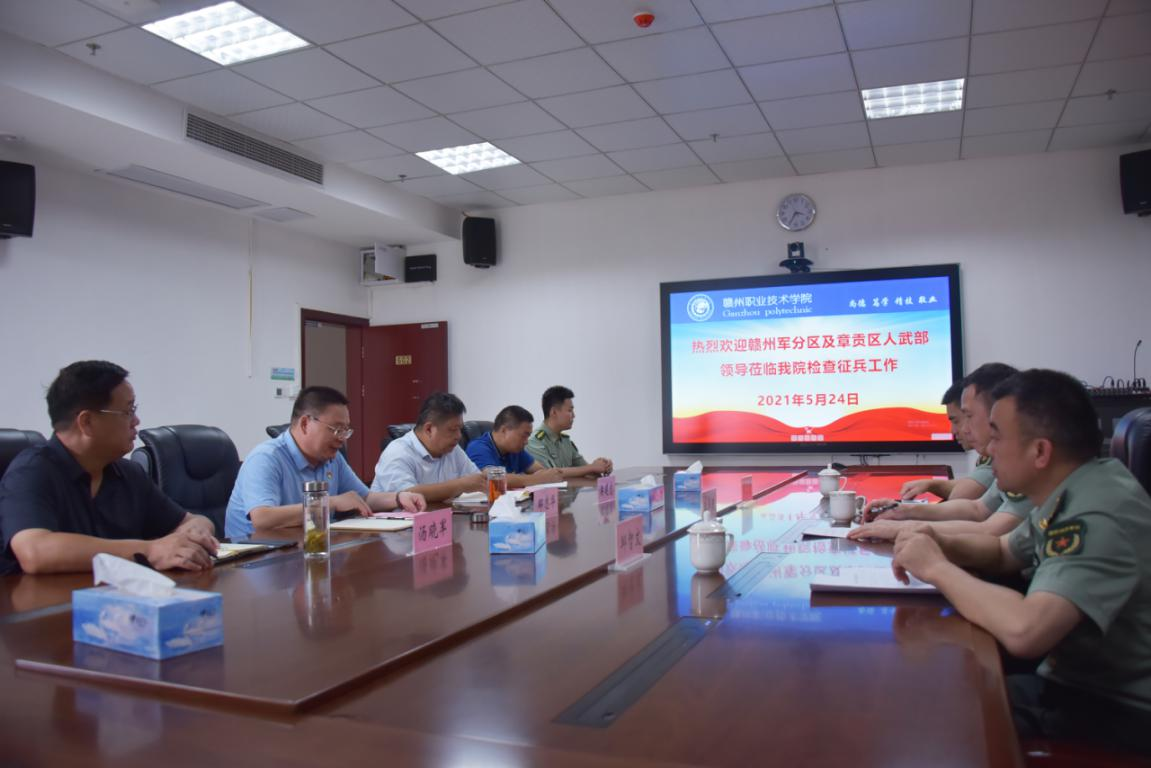 為積極響應(yīng)省征兵辦及省教育廳聯(lián)合下發(fā)的《關(guān)于開展高校征兵工作規(guī)范化建設(shè)自查檢查活動的通知》(贛征〔2021〕13號)文件精神,5月24日下午,章貢區(qū)人武部部長李澤民一行三人到我院進行高校征兵工作規(guī)范化建設(shè)檢查,學(xué)院黨委書記鄒志華、院領(lǐng)導(dǎo)潘建忠、湯曉軍、學(xué)院人武部、學(xué)工處負(fù)責(zé)人參加檢查會議。