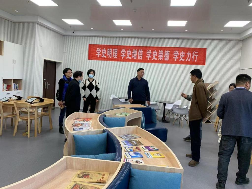 劉江毅一行在湯曉軍、姚炬平的陪同下參觀了圖書館各個閱覽區(qū)域,體驗了智能化設(shè)施設(shè)備。