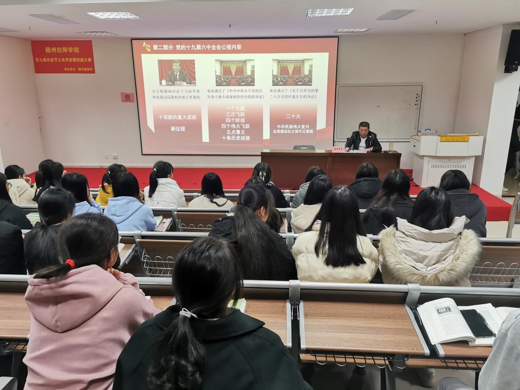 為持續推動學習貫徹黨的十九屆六中全會精神走深走實,12月22日下午,學院領導歐陽榮華走進“形勢與政策”課堂,在陽明樓112階梯教室以《學習貫徹黨的十九屆六中全會精神,爭做擔當民族復興大任的時代新人》為題作專題授課,為師生們宣講黨的十九屆六中全會精神。此次授課分主會場和分會場直播形式舉行,全院學生和思政課教師代表聆聽了此次專題授課。