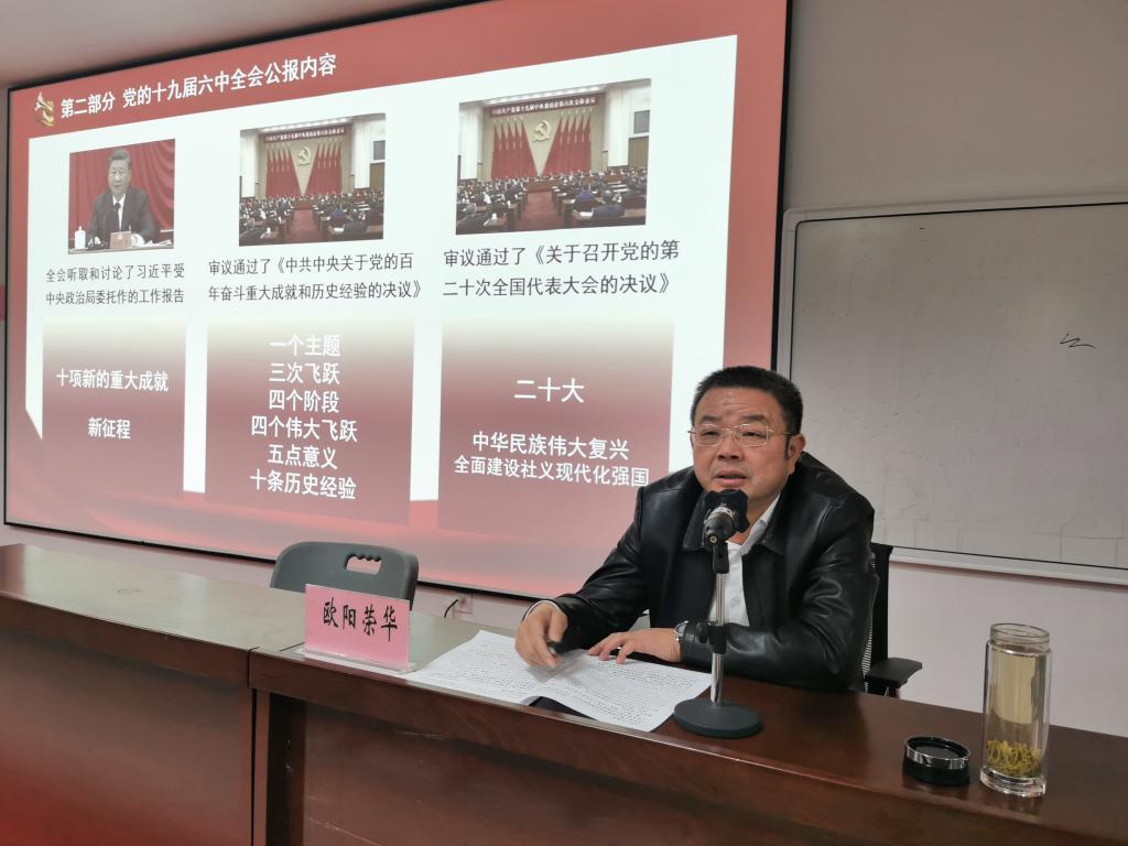 課上,歐陽榮華簡要介紹了黨的十九屆六中全會概況,他從十九屆六中全會召開的主要背景、重大意義、主題主線、主要精神以及做好新時代的趕考人等方面深入解讀全會精神,向師生分享了自己對全會精神的思考和體會。