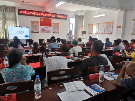 7月12日上午,在南安鎮梅山村黨群服務中心,舉行了“2022年第22期就業技能培訓——家禽飼養員”開班儀式,參加儀式的有大余縣就業創業培訓股股長郭靈芝,南安鎮梅山村黨群服務中心梅山村第一書記肖修昆,村支部書記羅利聰,綜合行政執法大隊大隊長鄧海富,學院動物科學系教師和志愿者們,村鎮中的部分養殖戶。