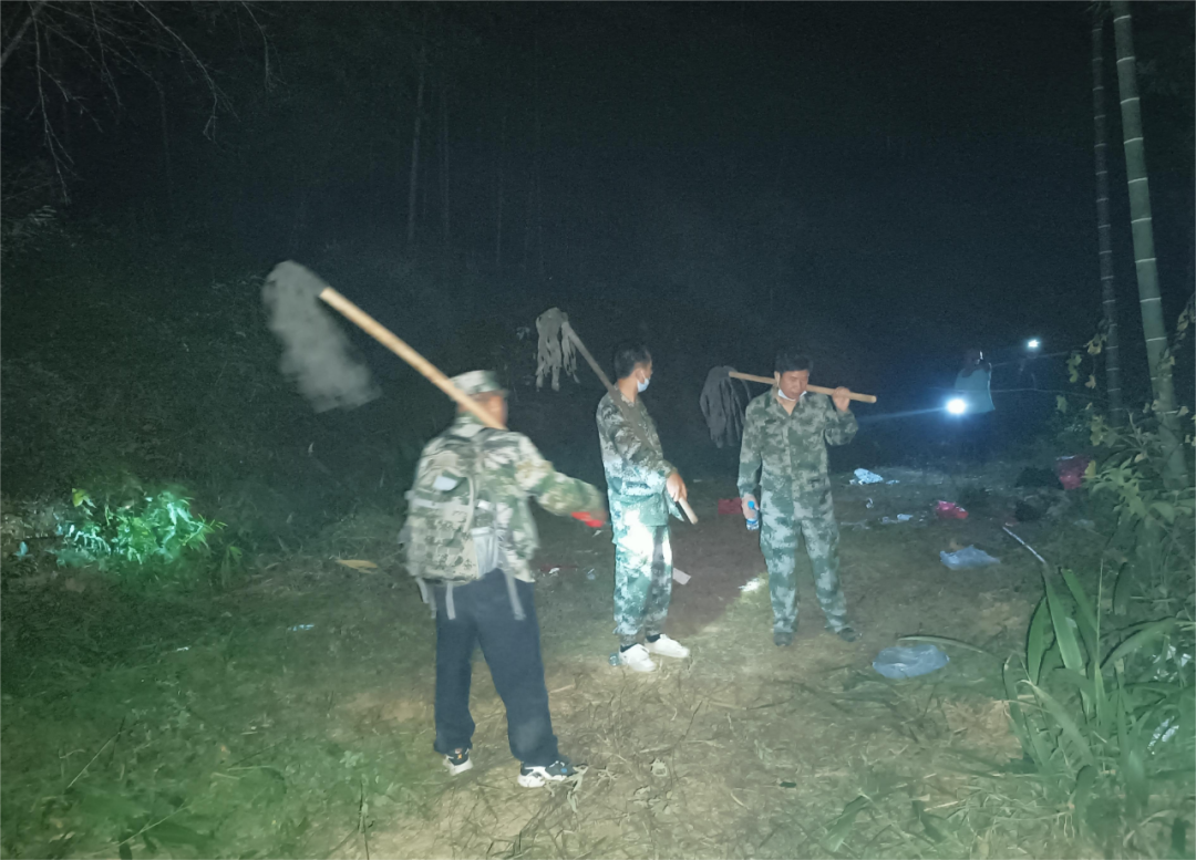 年近六十歲的駐村工作隊員肖修昆同志和廖明華同志根據(jù)平時演練程序,組織周邊黨員趕往火災(zāi)現(xiàn)場出戰(zhàn)滅火。“必須要將大火撲滅,保護群眾的生命安全。”肖修昆同志沉著冷靜地說。在火災(zāi)現(xiàn)場,大火熊熊燃燒,火場上聚集了好幾百人的滅火大軍,有專業(yè)的森林消防隊員、有各鄉(xiāng)鎮(zhèn)抽調(diào)來的志愿者、有當?shù)厝罕娮园l(fā)組織的撲救隊員、以及周邊縣派來支援的滅火小分隊。由于救火戰(zhàn)線長,后勤保障壓力大,駐村隊員們當晚露宿于天地山草之間。經(jīng)過晝夜奮戰(zhàn),全體滅火人員克服重重困難將大火撲滅。然而為了防止火勢復發(fā),駐村工作隊員堅持到第二天中午才撤出火場,順利返回到駐地——梅山村。