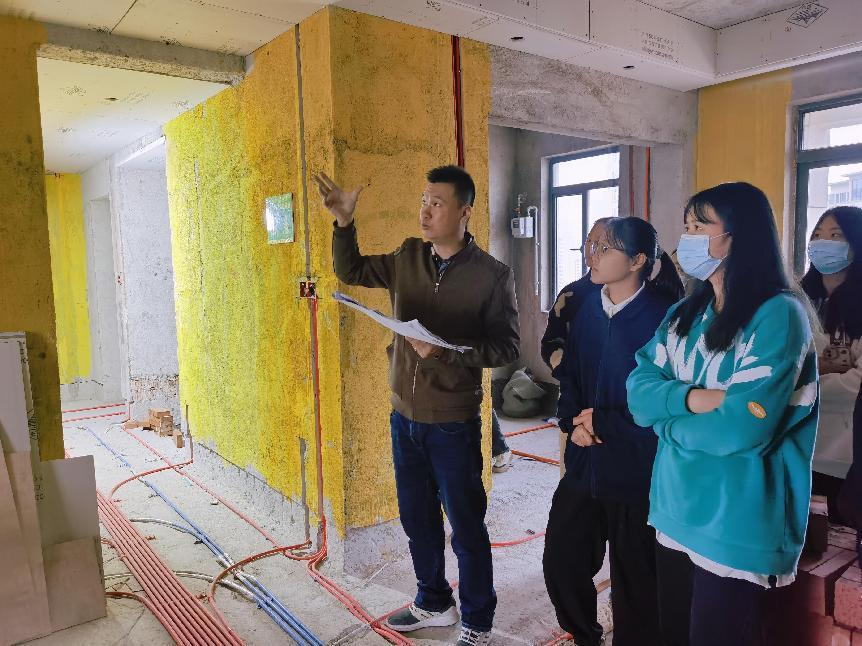 同學們參觀了140平米的四房戶型,老師現場給學生講解了強弱電、電源插座、衛生間和廚房管道預留布置、防水處理、燈具吊頂的設計和施工工藝,讓同學們將在課堂中學習到的室內裝飾制圖理論實操知識貫穿到施工現場。