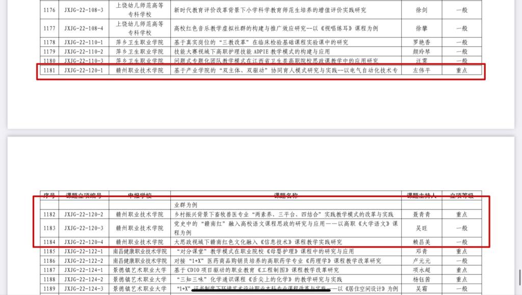近日,江西省教育廳公布了2022年江西省高等學(xué)校教學(xué)改革研究課題立項(xiàng)項(xiàng)目名單,我院獲批4項(xiàng)課題,其中重點(diǎn)項(xiàng)目2項(xiàng),我院左偉平老師申報(bào)的《基于產(chǎn)業(yè)學(xué)院的“雙主體、雙驅(qū)動(dòng)”協(xié)同育人模式研究與實(shí)踐--以電氣自動(dòng)化技術(shù)專業(yè)群為例》課題和聶青青老師申報(bào)的《鄉(xiāng)村振興背景下畜牧獸醫(yī)專業(yè)“兩素養(yǎng)、三平臺(tái)、四結(jié)合”實(shí)踐教學(xué)模式的改革與實(shí)踐》課題獲得重點(diǎn)項(xiàng)目立項(xiàng)。