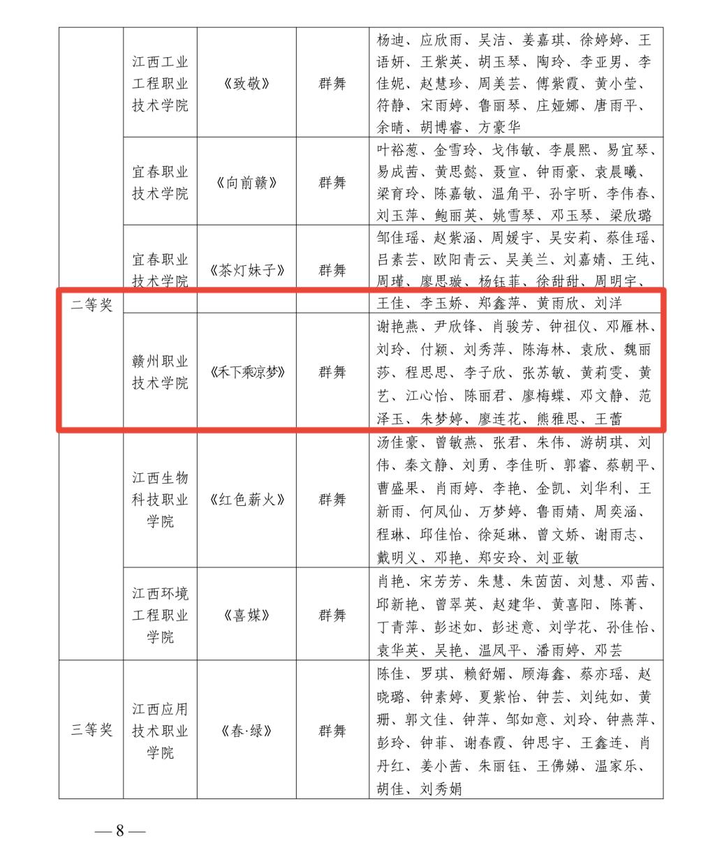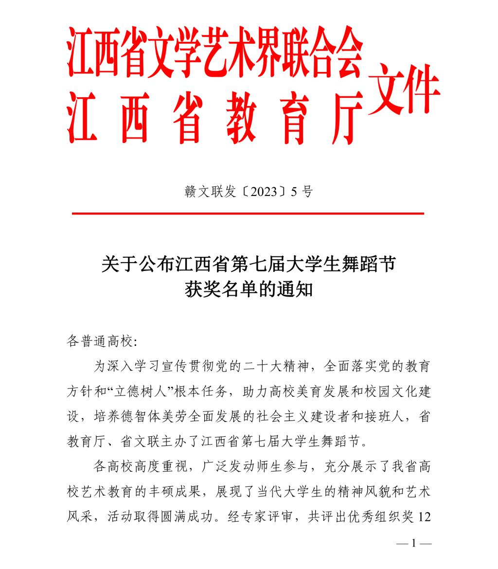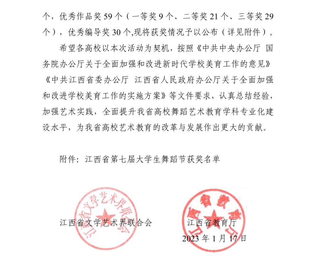 近日,由江西省教育廳、省文聯(lián)主辦的“江西省第七屆大學生舞蹈節(jié)”比賽獲獎名單揭曉,由現(xiàn)代服務系教師陳麗嬪、劉書瑤、鐘奕指導群舞作品《禾下乘涼夢》代表我院首次參賽,經(jīng)過激烈角逐,最終榮獲專科院校甲組二等獎和優(yōu)秀編導獎。
