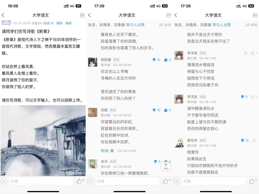近日,學(xué)院的大學(xué)語(yǔ)文“課程思政”示范課程進(jìn)行了一次有益的嘗試。在教師的引領(lǐng)下,學(xué)生們仿寫(xiě)了著名現(xiàn)代詩(shī)人卞之琳的詩(shī)作《斷章》,并將作品上傳到學(xué)習(xí)通平臺(tái),展現(xiàn)了出色的創(chuàng)作才華。