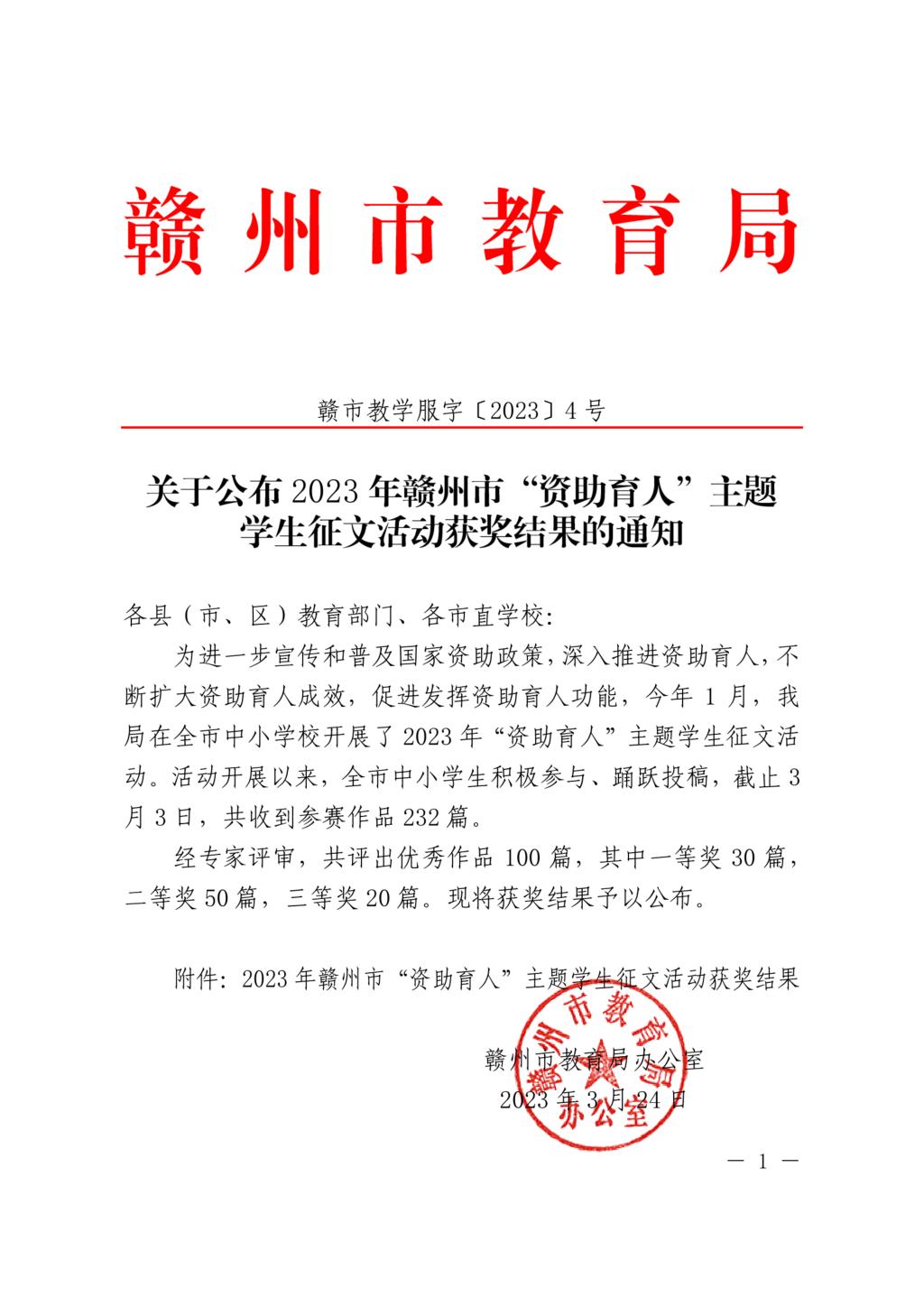 本次征文活動由贛州市教育局主辦,旨在進一步宣傳普及國家資助政策,深入推進資助育人,不斷擴大資助育人成效,促進發揮資助育人功能。據悉,本次活動共評選出優秀作品100篇,其中一等獎30篇,二等獎50篇,三等獎20篇。
