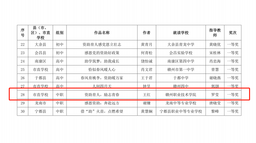 近日,贛州市教育局公布了2023年贛州市“資助育人”主題學生征文活動獲獎結果,我院在征文活動中斬獲佳績。我院教師羅瑩指導的學生作品《資助育人,勵志青春》獲一等獎,我院教師朱蓓蕾指導的學生作品《給我希望,我必茁壯成長》獲二等獎。