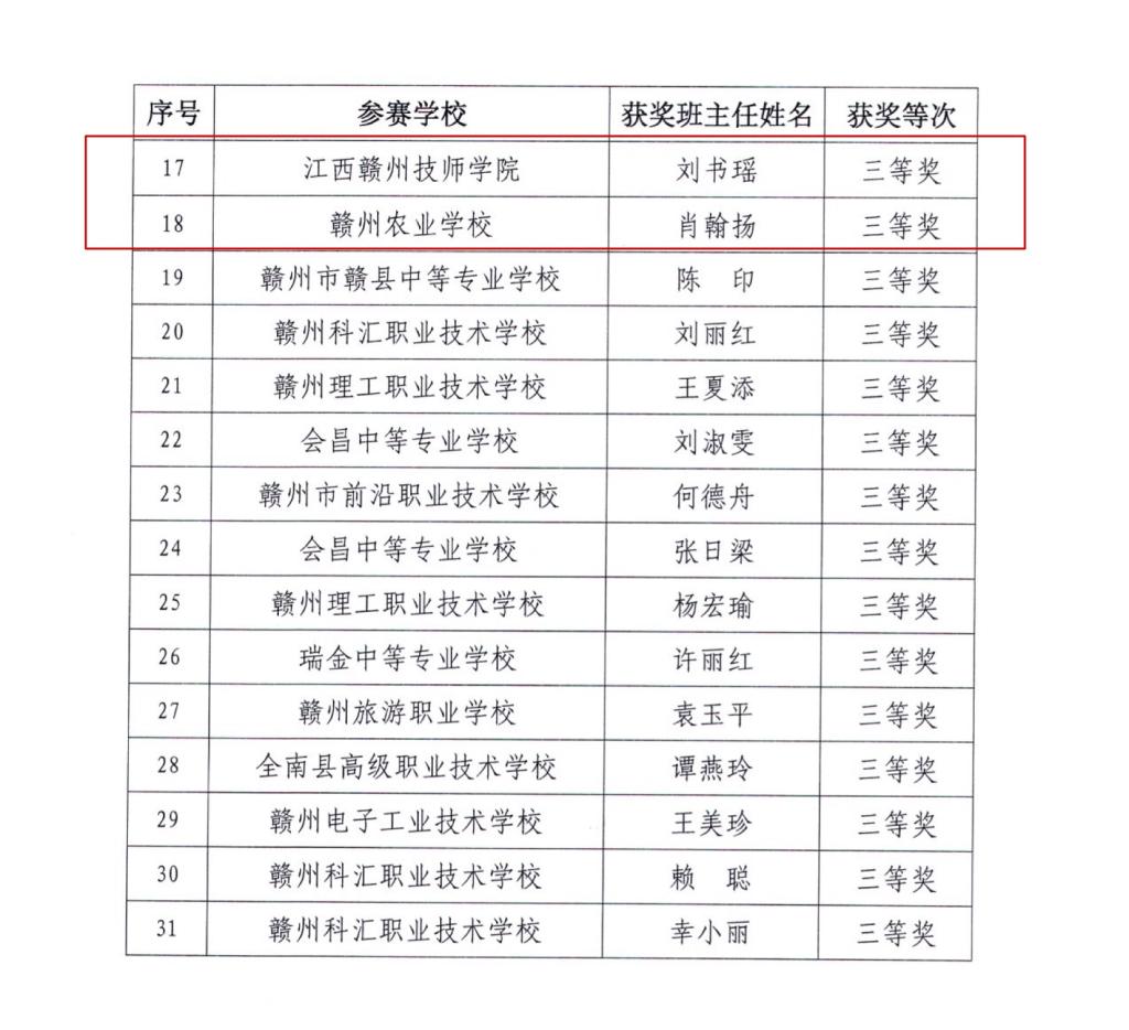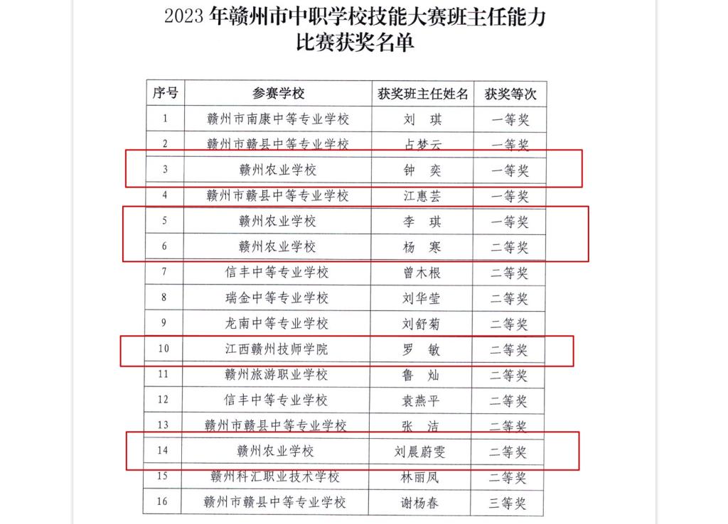 立德樹人守初心,百舸爭流展風(fēng)采。在贛州市教育局舉辦的2023年中職學(xué)校技能大賽班主任能力大賽中,我院班主任鐘奕、李琪榮獲一等獎;班主任楊寒、羅敏、劉晨蔚雯榮獲二等獎;班主任劉書瑤、肖翰揚(yáng)榮獲三等獎。