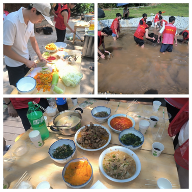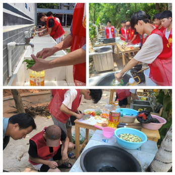 秉承“自己動手,豐衣足食”的勞動精神,午飯時間,實踐隊員們自己動手做飯,在身體力行中感悟勞動的價值。他們分工合作、秩序井然,在樹林中撿柴、撈魚、于灶臺處生火,洗菜、切菜、炒菜、洗碗......各個步驟進行得有條不紊。不一會兒,可口的飯菜就上桌了,生火做飯中蘊含著勞動的力量,正是隊員們的辛勤勞動,才有了飯桌前的菜肴。許多志愿者在用餐時不禁感嘆:“自己做的飯就是香”。