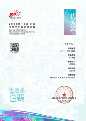 近日,第15屆全國大學生廣告藝術大賽落下帷幕,由藝術設計系劉玥池老師指導的學生李國康作品《快準穩》獲得全國總評審(決賽)優秀獎,韓思語老師指導的學生鐘欣桐、謝順鑫作品《泡泡瑪特x國粹機甲系列》獲得江西賽區三等獎,總體成績是我院參加該賽事以來的最好記錄。