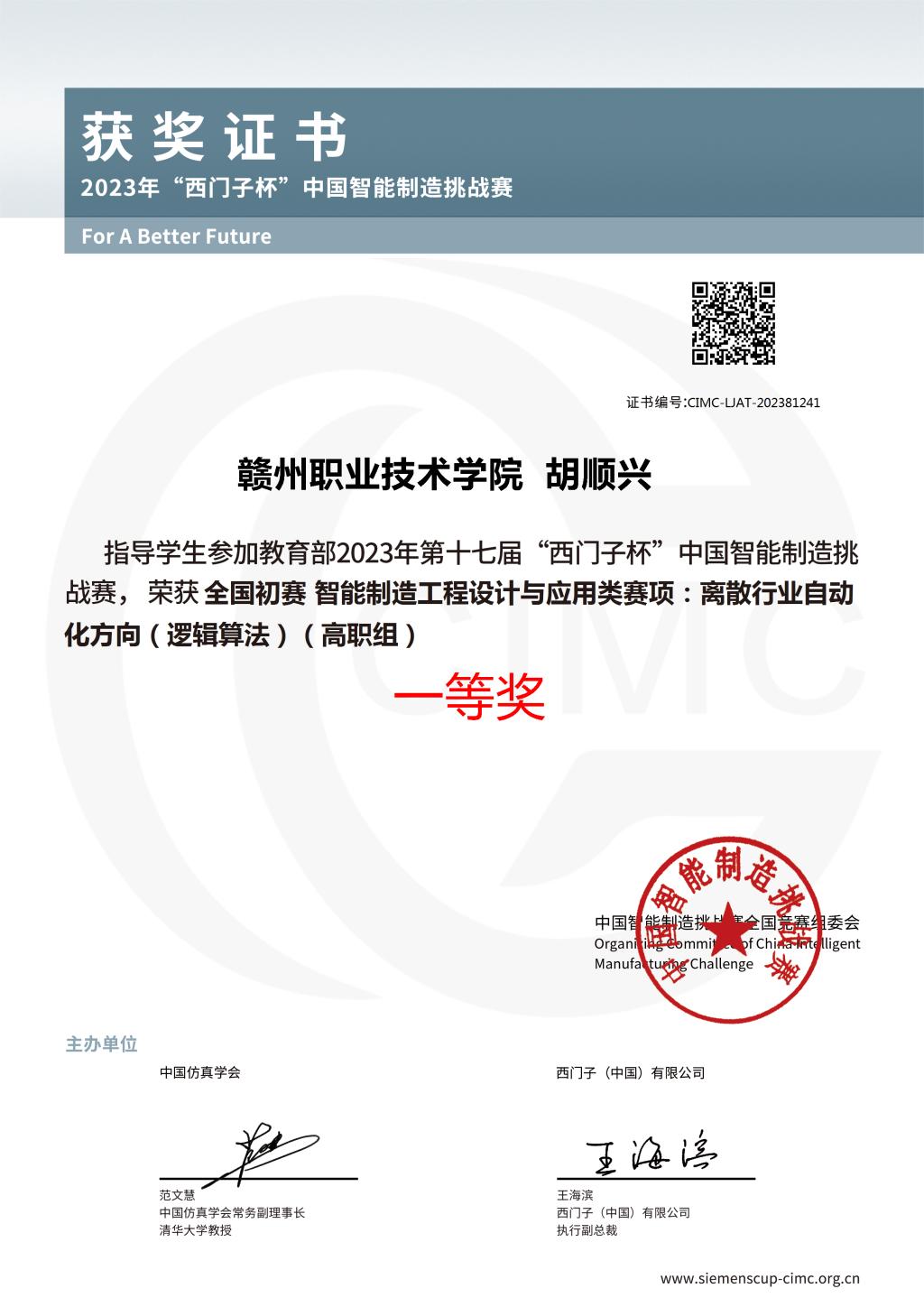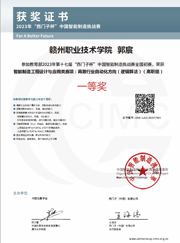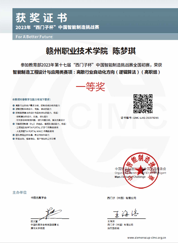 近日,教育部第十七屆CIMC“西門子杯”中國智能制造挑戰賽圓滿閉幕。經過激烈角逐,由學院電氣工程系胡順興老師指導的池志鴻、陳夢琪、郭宸三名學生榮獲全國一等獎;尚文韜、周文杰、孔小平三名學生榮獲全國二等獎;何翌、廖源、彭邦宇三名學生榮獲全國三等獎。