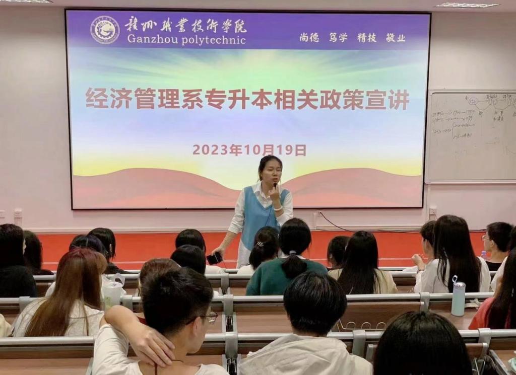 為引導學生科學合理進行學習規劃,幫助學生掌握專升本考試信息,經濟管理系于10月19日下午在陽明樓112階梯教室舉辦了“專升本政策宣講會”。2022、2023級的同學們參加了線下會議,2021級同學參加線上會議,會議由經濟管理系楊婷老師主持。