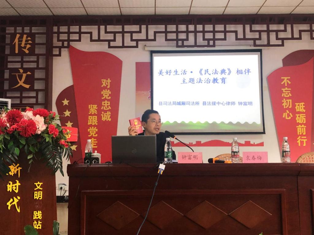 法治大講堂“美好生活·《民法典》相伴”由全南縣司法局城廂司法所所長鐘富明主持,他強調了法律規定對于維護公民權益和社會穩定的重要性,并鼓勵學生們積極學習法律知識,通過一些典型案例生動形象的講解了關于校園欺凌、電信詐騙、高空拋物、被他人飼養的動物咬傷等熱門話題,提高了幫助學生們理解法律規定如何應用于日常生活中。
