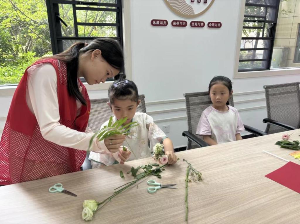 活動(dòng)最后,在志愿者的指導(dǎo)下,孩子們開始制作獻(xiàn)給祖國的迷你花束。豆蔻多頭玫瑰代表著風(fēng)華正茂、綠桔梗代表著堅(jiān)強(qiáng)自信、腎蕨代表著富足美滿,用于制作花束的花材組合在一起寓意著我們的祖國在歷史洪流中屹立不倒、挺立潮頭,未來會(huì)更加繁榮昌盛、國富民強(qiáng)。在志愿者的幫助下,小朋友開始搭配花朵、修剪花枝,將自己對(duì)祖國的熱愛與祝福融入到每一朵鮮花中。經(jīng)過一個(gè)小時(shí)的制作,一束束精美的小花束在孩子們手中綻放,每一束都飽含著孩子們對(duì)黨和祖國的深厚情誼。
