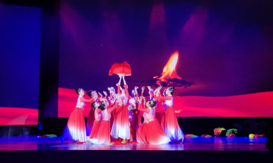 《星星之火》以波瀾壯闊的中國革命歷程為藍本,巧妙融合紅扇與紅綢的靈動之美,將中國共產(chǎn)黨“歷經(jīng)風(fēng)雨、矢志不渝”的奮斗歷程和“星星之火,可以燎原”的革命信念,以舞蹈的語言生動再現(xiàn)。舞臺上,光影交錯間,舞者們的每一個動作、每一次隊形變換,都仿佛是在訴說著那段崢嶸歲月中的堅韌與希望,讓在場的每一位觀眾都感受到了那份從微小火種匯聚成燎原之勢的磅礴力量。