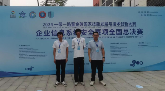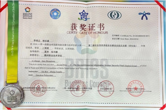 在總決賽中,我校信息工程學院學子信安2311班的李錦云和網絡2212班的郭忠康憑借扎實的技能和默契的配合,在比賽中展現出了出色的技術水平和解決問題的能力。他們面對復雜的企業信息系統安全挑戰,迅速分析、準確判斷,并采取了有效的安全措施,成功抵御了各種網絡攻擊和威脅。經過激烈的角逐,他們最終獲得了銀牌、二等獎的優異成績。這一成績的取得,充分展示了我校學子在企業信息系統安全領域的卓越才能和扎實功底。指導老師夏奔、張豐麟老師也被授予了“優秀指導老師”的榮譽稱號