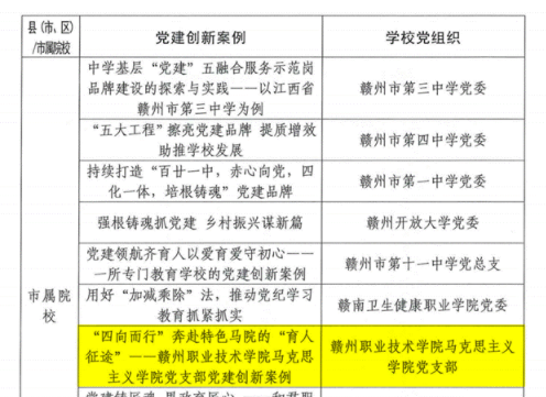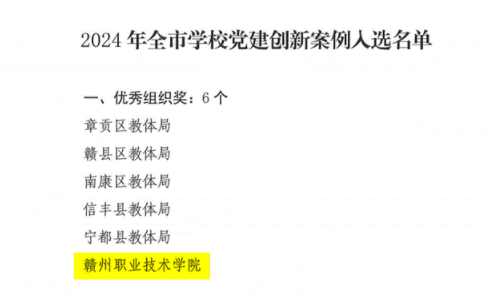 近日,贛州市教育工委公布了“2024年全市學校黨建創新案例入選名單”,我校獲得優秀組織獎,推薦的《“四向而行”奔赴特色馬院的“育人征途”》成功入選市級優秀黨建創新案例。