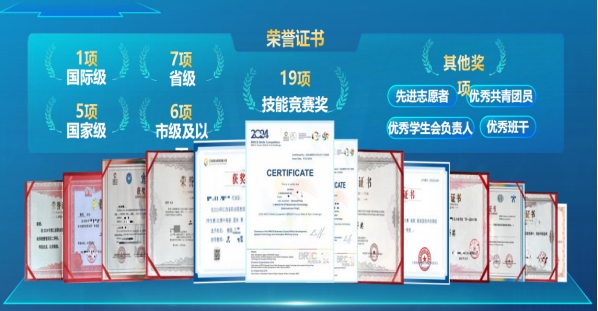 在競賽舞臺上,賴琨同樣成績斐然。憑借著扎實的專業技能和創新能力,在國內外高水平職業技能競賽中屢創佳績,累計獲獎近20項,涵蓋國際級、國家級、省級等多個層次,充分展現其技術實力與競技水平。目前共榮獲國際級榮譽1項,國家級榮譽5項,省級榮譽7項。在第三屆江西省大學生職業規劃大賽中,他憑借清晰的職業發展路徑和行業洞察力,斬獲成長賽道銀獎第一名,充分彰顯了優秀的職業素養與競技實力。