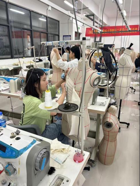 服裝創意設計與工藝賽項,參照省級職業院校技能大賽標準,以“融古匯今”為題,設置服裝創意設計、立體裁剪、成衣工藝制作三大模塊,21服裝五年制、服裝23級學生全員參與,參賽隊伍在8小時內完成從設計構思、繪制草圖到成品制作的全流程比拼。