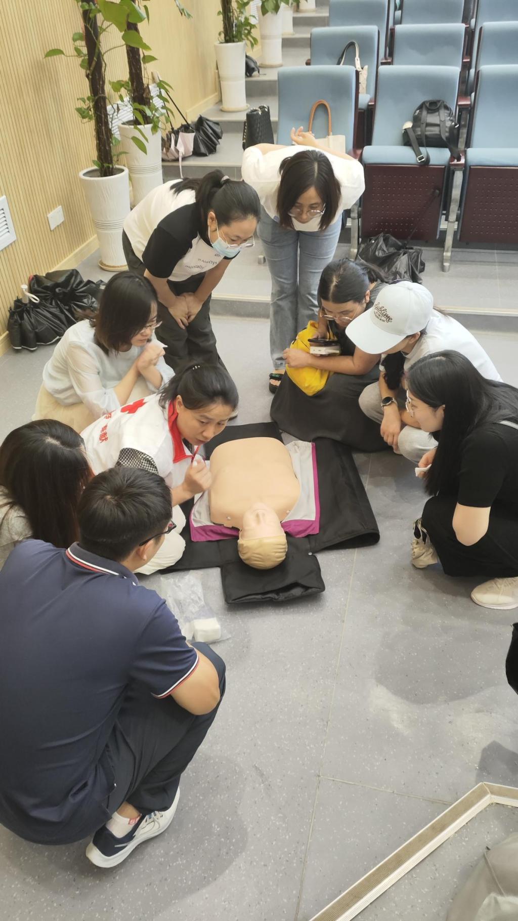 實操演練階段,參訓人員分組利用模擬人進行心肺復蘇和包扎練習。紅十字會師資團隊穿梭于各組之間,進行一對一指導,不放過任何一個細節,從手部姿勢到按壓力度,從包扎手法到固定技巧,確保每位教職工的動作規范到位。
