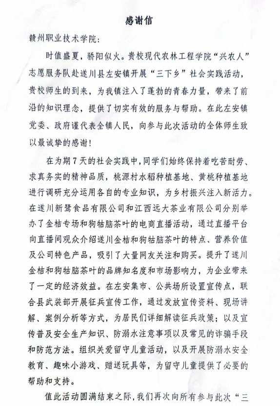 近日,贛州職業技術學院現代農林工程學院大學生三下鄉“興農人”志愿服務隊在遂川縣左安鎮開展的為期7天社會實踐活動圓滿落幕。這支充滿青春活力的隊伍,以專業知識為筆、以實干行動為墨,在遂川大地上書寫了助力鄉村發展的青春篇章,其優異表現獲得遂川縣左安鎮政府的高度認可并發來感謝信。信中贊揚了“興農人”志愿服務隊同學在為期7天的社會實踐中,始終保持著吃苦耐勞、求真務實的精神品質。為左安鎮注入了蓬勃的青春力量,帶來了前沿的知識理念,提供了切實有效的服務與幫助。也感謝學校的精心組織與大力支持,為左安鎮的發展奉獻了寶貴的青春智慧和專業力量。