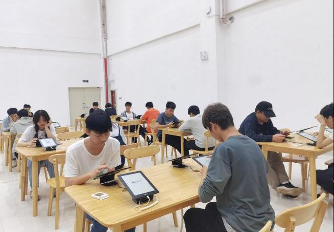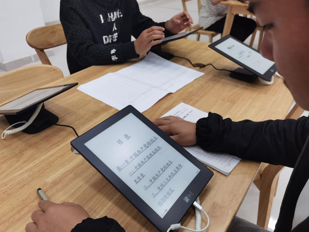 同學們通過電子平板閱讀器,下載黨史學習資料,在閱讀平板上查閱黨史資料。