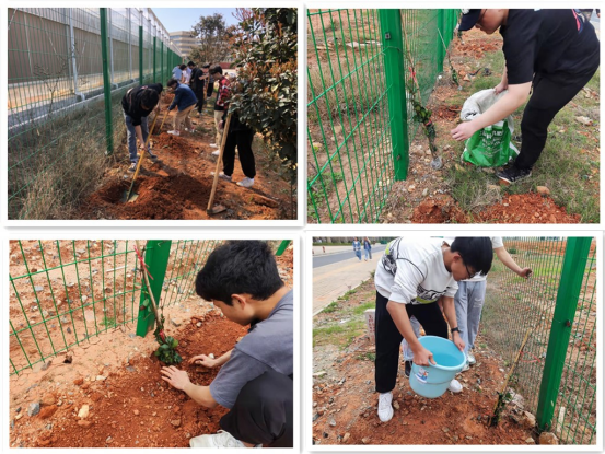 在現代農業基地圍欄周邊,師生們熱情高漲、分工協作,開穴、施基肥、扶正花苗、揮鍬培土、提水澆灌,大家互幫互助,配合默契,共同栽下了一棵棵小花苗。他們臉上流下辛勞的汗水,卻掛著喜悅的微笑。