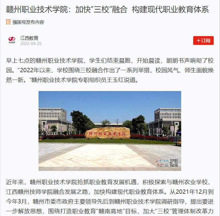 近年來,贛州職業(yè)技術(shù)學(xué)院搶抓職業(yè)教育發(fā)展機遇,積極探索與贛州農(nóng)業(yè)學(xué)校、江西贛州技師學(xué)院融合發(fā)展之路,加快構(gòu)建現(xiàn)代職業(yè)教育體系。從2021年12月到今年3月,贛州市委市政府主要領(lǐng)導(dǎo)先后到贛州職業(yè)技術(shù)學(xué)院調(diào)研指導(dǎo),提出要進(jìn)一步解放思想,圍繞打造職業(yè)教育“贛南高地”目標(biāo),加大“三校”管理體制改革力度,學(xué)習(xí)借鑒先進(jìn)發(fā)達(dá)地區(qū)經(jīng)驗,整合各類資源,理順管理體制,創(chuàng)新辦學(xué)模式,加強隊伍建設(shè)。全力辦好人民滿意的職業(yè)教育,為建設(shè)革命老區(qū)高質(zhì)量發(fā)展示范區(qū)提供強有力的人才支撐。