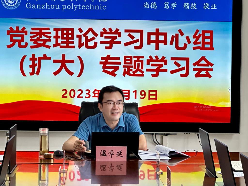 10月19日上午,學院在行知樓六樓會議室召開黨委理論學習中心組(擴大)學習會,深入學習貫徹習近平總書記考察江西重要講話精神,習近平總書記在進一步推動長江經濟帶高質量發展座談會上的重要講話精神以及全省、全市領導干部會議精神,并結合實際研究學院貫徹落實措施。黨委書記溫學延主持會議并講話,黨委副書記、院長吳躍文,在家黨委領導班子成員、各黨支部書記和相關部門負責同志參加學習會。