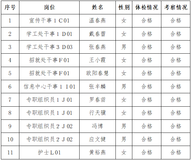 根據《贛州職業技術學院2021年面向社會公開招考工作人員公告》要求,經過報名、資格審查、筆試、面試、體檢、考察等程序后,現將溫春燕等11名擬聘用人員進行公示。